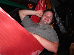 also ringed in by hammocks. It had four or five small, low tables and