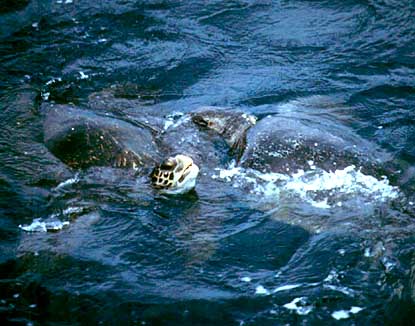 The Olive Ridley Lepidochelys olivacea is apparently the most common sea-turtle in the world -- at least based on the numbers of females coming ashore in Central America -- but it is threatened by being slaughtered when they do come ashore (a decade ago, some 75,000 were killed annually in Mexico alone). Both species of ridley come ashore to lay eggs in huge arribadas -- spectacular arrivals of thousands of turtles on the same beach on the same night. The Olive Ridley is also caught in long lines and gill nets in the open sea. During my four month cruise way offshore in the eastern tropical Pacific, it was certainly the most common sea turtle. One of my cruise duties was to attempt to identify and document each turtle we discovered; this Olive Ridley, below, was thousands of miles offshore at 10°39'N, 139°47'W. The primary distribution of this turtle is tropical, but there are a couple records as far north as Monterey Bay.